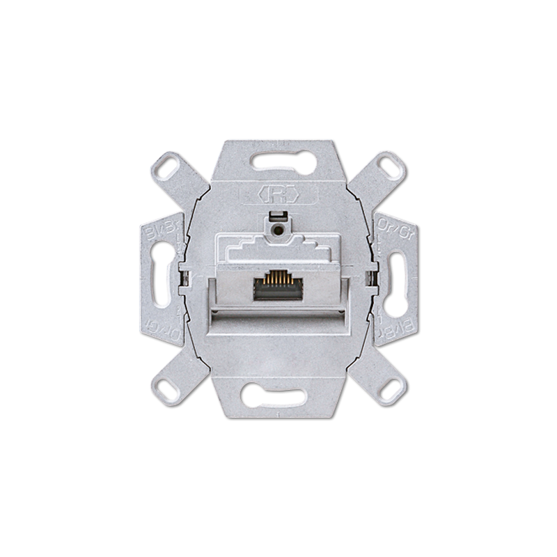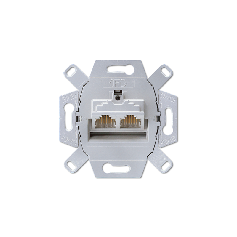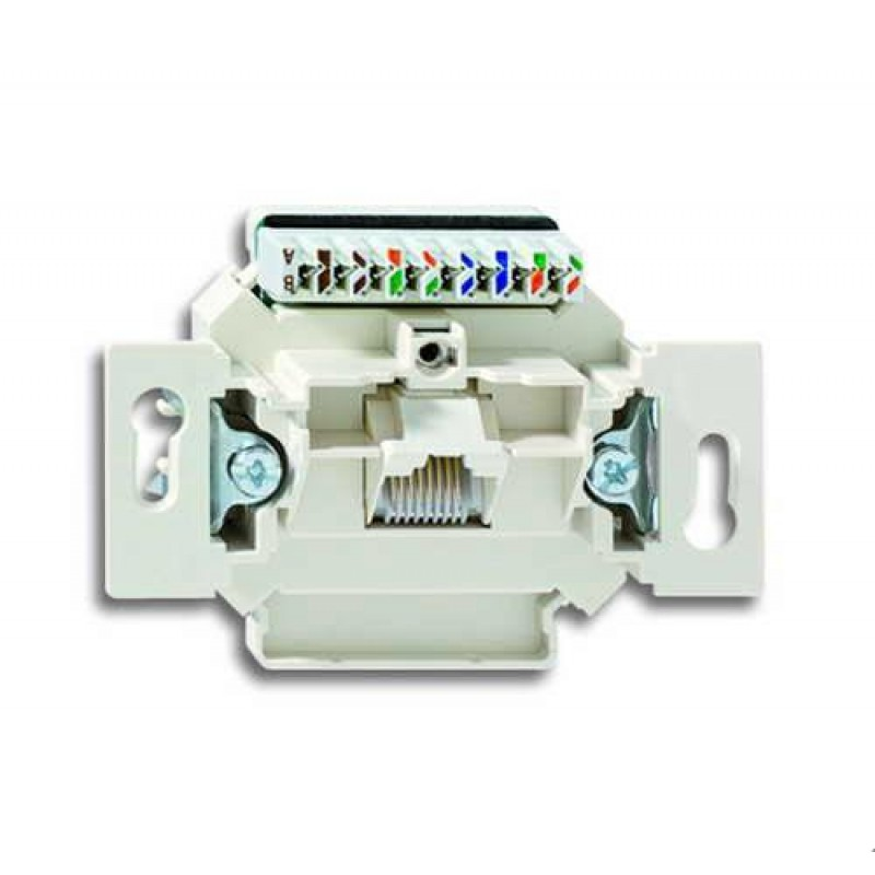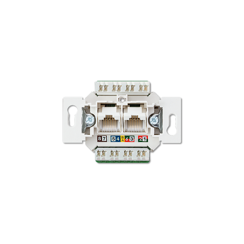 Tvirtinimas varžtais. Gnybtai LSA-PLUS. RJ 45 kategorija 6A, klasė EA (10 Gbit/s / 500 MHz). Suderinamas ir su ABB serijos kompiuteriniais dangteliais.