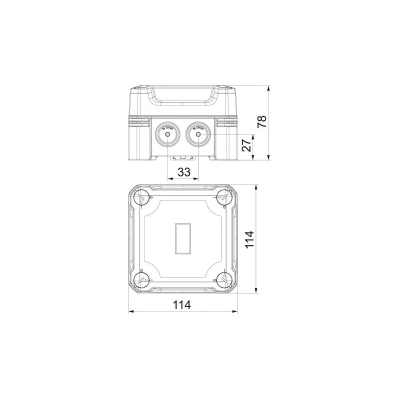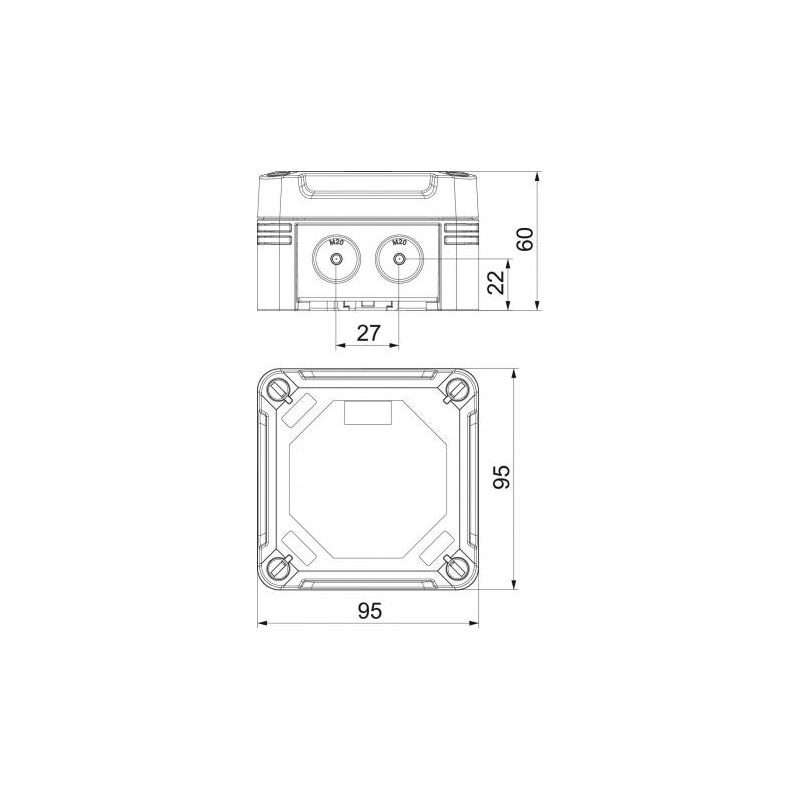 Jungiamoji dėžutė, skirta kabeliams ir linijoms prijungti viduje ir lauke. Kvadratinis dizainas su išmuštais įėjimais. Tinka montuoti ant sienos ir lubų su galimybe tvirtinti išorėje, viduje arba montuoti per kampinius kupolus. Ypač atsparus smūgiams su IK09. Dangtis su greitu užraktu, sandarinamas. Pagaminta iš UV spinduliams atsparių ir halogenų neturinčių medžiagų.