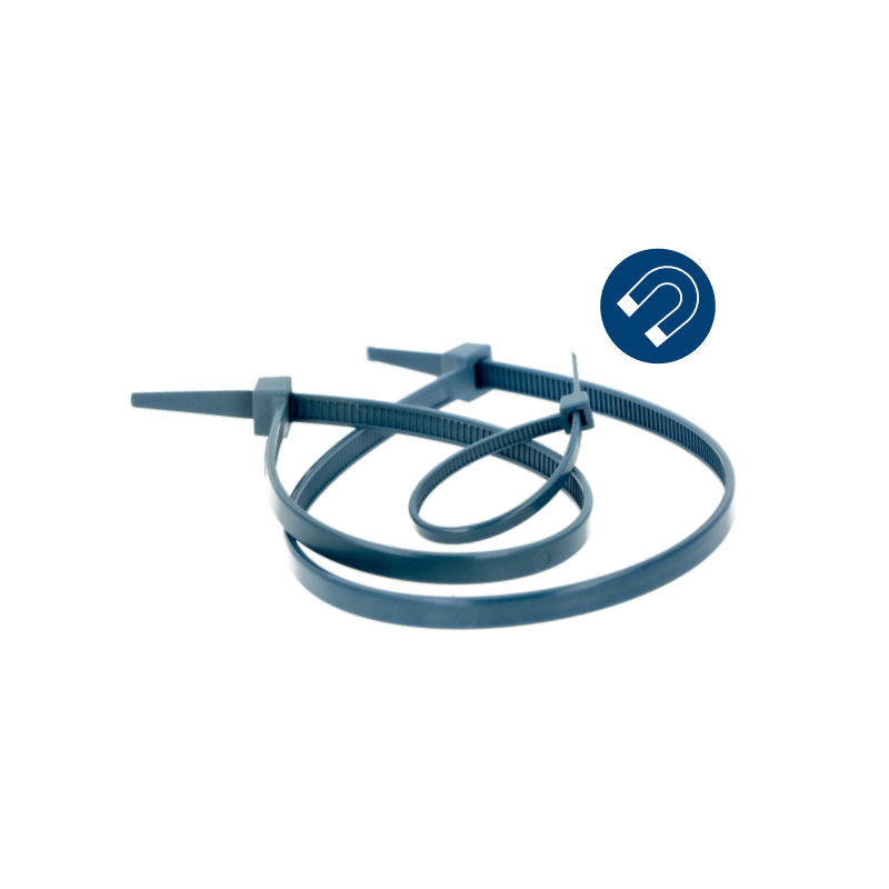 TRYTYTKI DET wykrywane przez detektor metalu przeznaczone do stosowania wszędzie tam gdzie zachodzi konieczność wyeliminowania ryzyka zanieczyszczenia w trakcie procesu wytwarzania np. produktów spożywczych lub farmaceutycznych, elementami wchodzącymi w skład linii produkcyjnych itp. Opaski kablowe wykrywalne wykonane są z poliamidu z domieszką opiłków metalu (tlenków metalu), które nadają im bladoniebieskiego koloru. W przemyśle spożywczym lub farmaceutycznym stosuje się je również do zamykania woreczków, pojemników lecz jedynie w wypadku braku bezpośredniego kontaktu z zawartością opakowania. Opaski nie są przeznaczone do bezpośredniego kontaktu z żywnością lub farmaceutykami.