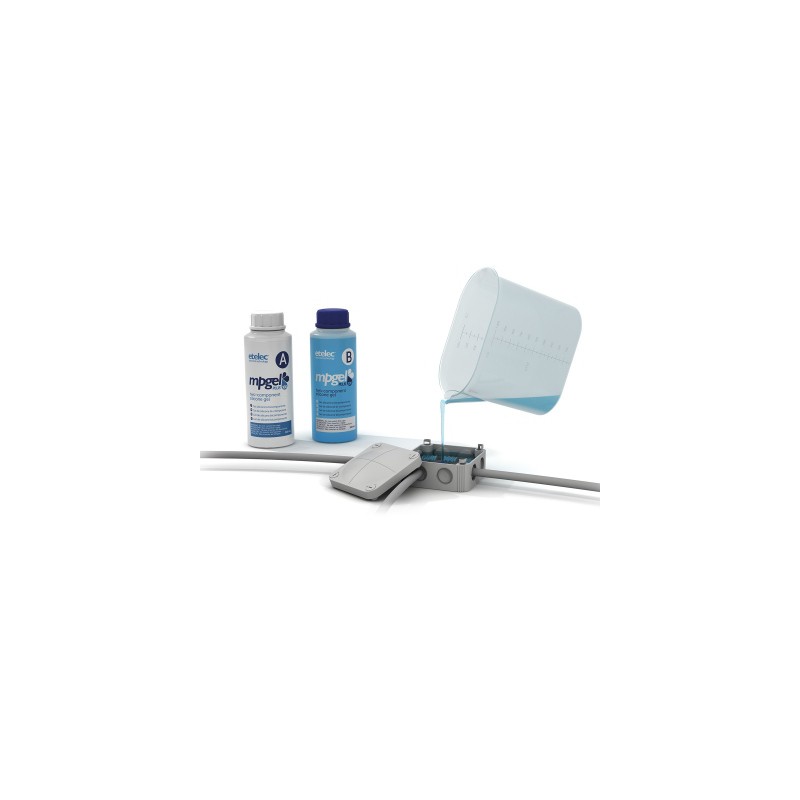 Potrzebna ilość żelu tworzy się samoczynnie z dwóch składników (A), które są mieszane (B). Po 8 minutach taki płynny żel może być używany do wypełnienia przestrzeni, w której będzie wykonane połączenie. Płynna forma żelu pozwala mu przeniknąć do najdrobniejszych porów i pustek zalanej przestrzeni. Po kilku minutach żel uzyskuje ostateczne właściwości izolacyjne. Nie ma daty ważności i nie trzeba zużywać go za jednym razem.